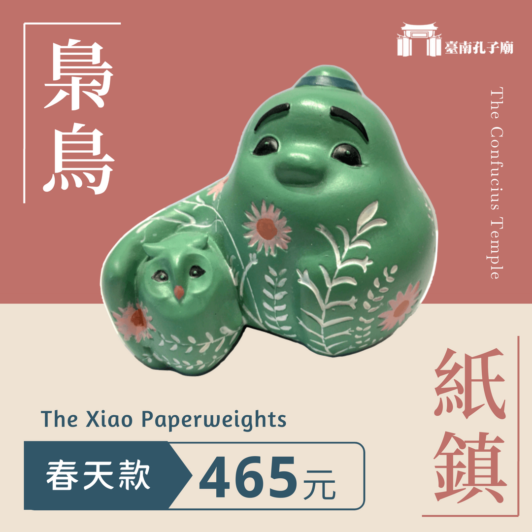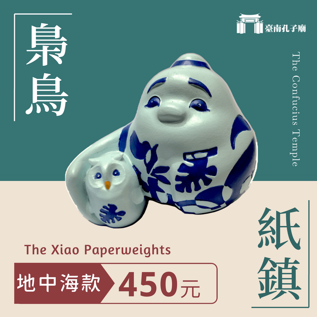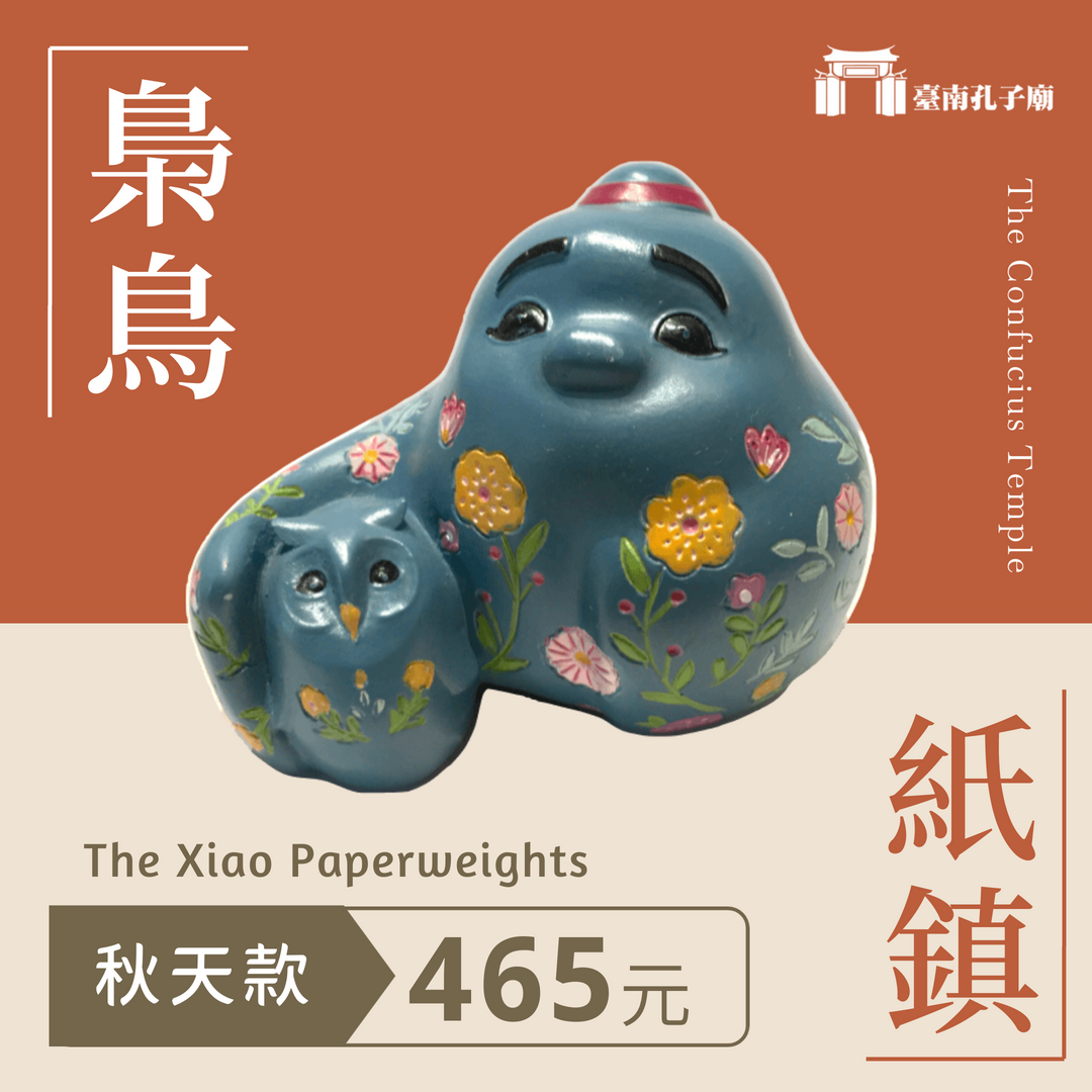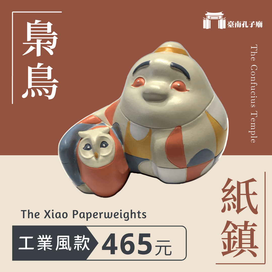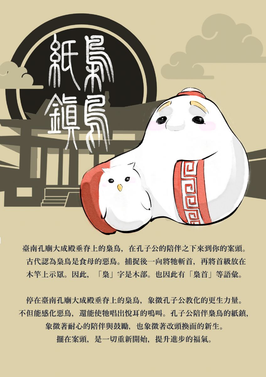 臺南孔廟文創商品「梟鳥紙鎮」,傳遞著孔子有教無類陪伴梟鳥的精神,並化為梟鳥紙鎮和孔子公一起,飛到你的案頭。