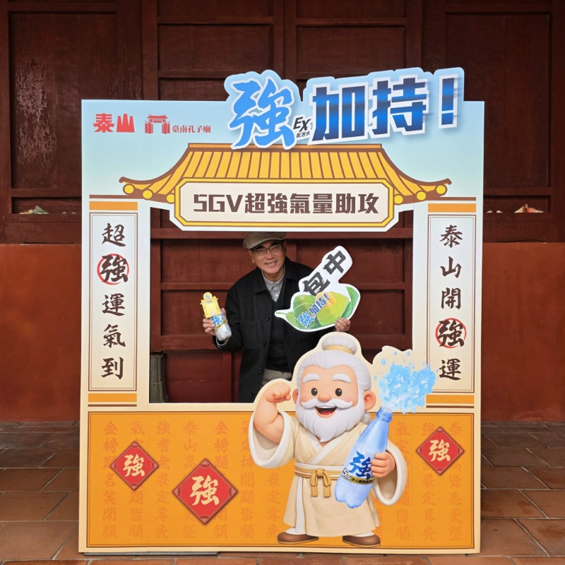 自 1 月 6 日至 1 月 18 日,共同合作推出「考前強運儀式」,考生只要憑應考證明至臺南孔廟紀念品服務部,即可免費領取「泰山強運氣泡水」乙瓶。將「氣泡」與「運氣」結合,鼓勵學子先拿取獨家限量祈福卡寫下心願,再至大成殿拜孔子、以成書院拜五文昌,以及至文昌閣拜魁星,完成「憑證領氣、寫下強願、一鼓作氣」的三部曲,透過5GV超強氣量帶來的清爽暢快感,讓氣泡在口中綻放,不只是提神的瞬間,更象徵著為自己注入一份「我已準備好」的信念,為考生注入強勢考運,在重要考試時刻進入最強應試狀態。