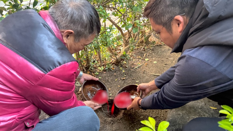 執事者二人盆裝祭品牛、羊、豬的毛血至大成門外,掘土埋之。