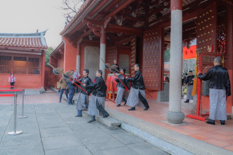 在未上祭前敲擊鼖鼓三通(每通108響,每通間隔15分鐘),通知與祭人員準備,接著禮樂舞生於大成門外階下整列,後排班進殿並陸續就位。